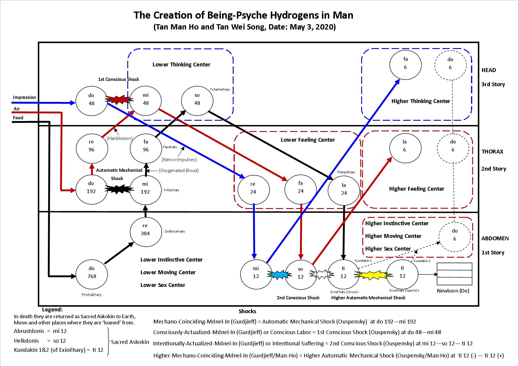 "The fourth way WORK would in the coarse of refinement from the ingested coarse higher density of matter and lower density of vibration of being-psyche hydrogens (H768, H192 and H48) into the digested fine lower density of matter and higher density of vibration of being-psyche hydrogens (H12 and H6) necessary for the reciprocal cosmic maintenance of the fillings in the Organic-Synthetic Life at the MI-FA Interval and also for the fillings in the Will of the Absolute at the TI-DO Interval of the (our) Ray of Creation.  The  being-psyche hydrogens H12 and H6 to the organic-synthetic life (ecosystems of the geocosmic, the biocosmic, the sociocosmic, the technocosmic and the human civilizational octaves) and some being-psyche hydrogens H6 to the Will of the Absolute (in the ecosystems of quantum octaves and our cosmic octave)."