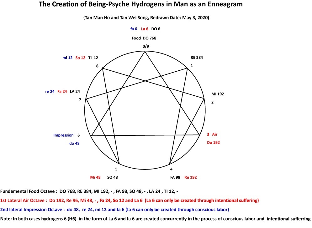 "The fourth way WORK would in the coarse of refinement from the ingested coarse higher density of matter and lower density of vibration of being-psyche hydrogens (H768, H192 and H48) into the digested fine lower density of matter and higher density of vibration of being-psyche hydrogens (H12 and H6) necessary for the reciprocal cosmic maintenance of the fillings in the Organic-Synthetic Life at the MI-FA Interval and also for the fillings in the Will of the Absolute at the TI-DO Interval of the (our) Ray of Creation.  The  being-psyche hydrogens H12 and H6 to the organic-synthetic life (ecosystems of the geocosmic, the biocosmic, the sociocosmic, the technocosmic and the human civilizational octaves) and some being-psyche hydrogens H6 to the Will of the Absolute (in the ecosystems of quantum octaves and our cosmic octave)."